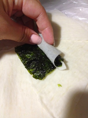 2. Place a sheet of seaweed on the trimmed skin and start rolling from the widest point inwards to the sharpest point. Use the mixture to seal the sharpest point well.